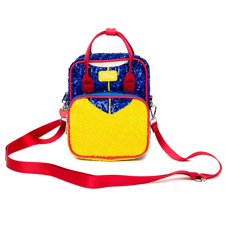 Carry your essentials for a day out in this sparkly crossbody bag from Buckle-Down. Two separate, zipper-closure compartments provide secure spaces for your phone, wallet, keys, makeup and more. This cute purse is covered in blue and yellow sequins resembling Snow White’s dress with a signature, shiny red apple charm as the zipper pull. Crafted from premium faux leather, this stylish bag includes an adjustable strap and easily converts to a mini backpack, or it can be carried by its handles. The Snow White crossbody makes the perfect accessory for a Disney Princess fan.