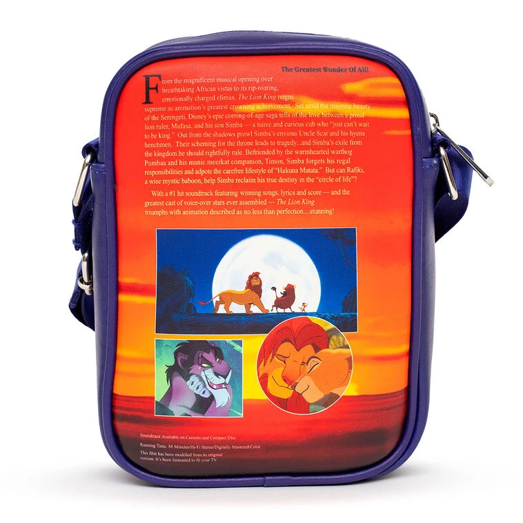 - Buckle-Down faux leather crossbody bag features a replica of “The Lion King” VHS movie box design.