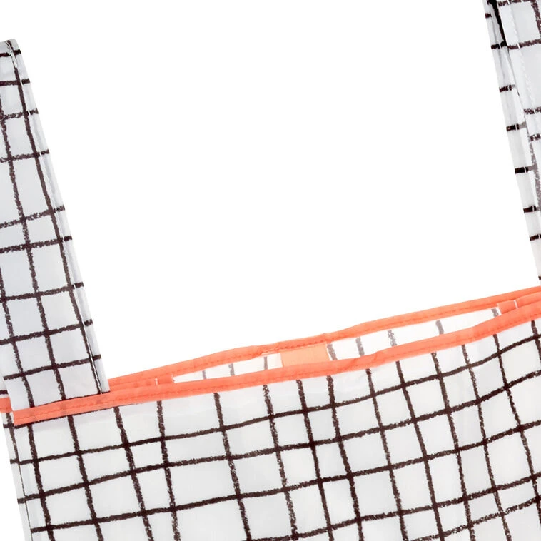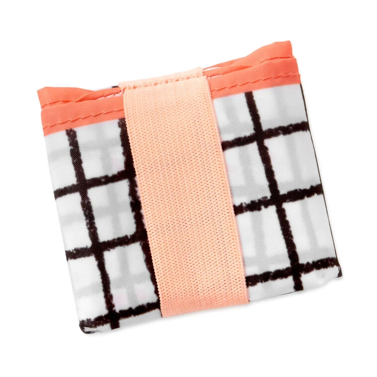 - Reusable, foldable market bag in black and white grid pattern with coral accents.