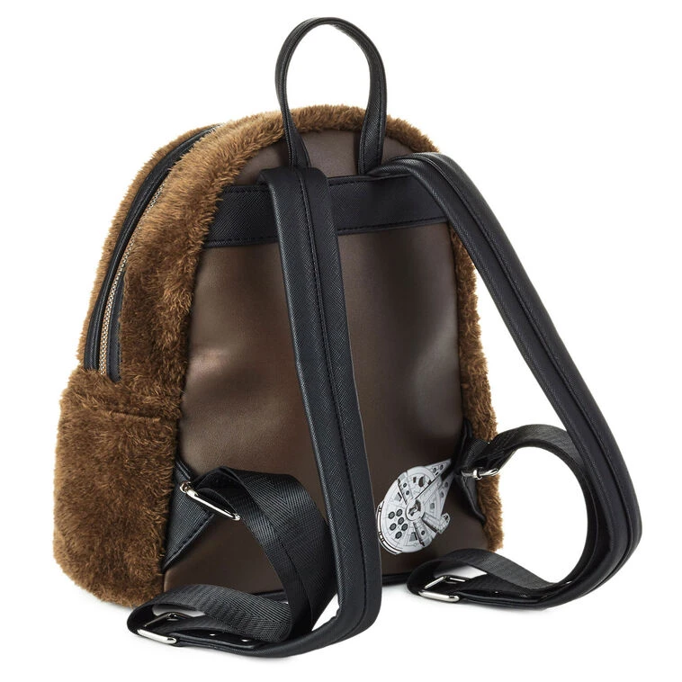 - Loungefly Star Wars mini backpack features faux fur Chewbacca design with appliqué details and faux leather back panel with image of the Millennium Falcon.
