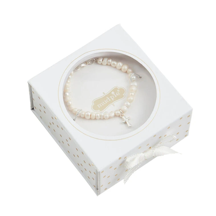 - Mud Pie children’s pearl bracelet with silver metal cross charm.