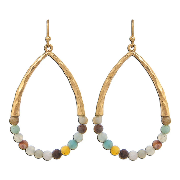 These versatile beaded earrings are a must-have for anyone’s jewelry collection. Drop earrings from Rain Jewelry feature a gold-tone teardrop outline with small colorful beads creating the base of the design. The handcrafted wearable art makes a lovely gift for her birthday, an anniversary, the holidays or just because.