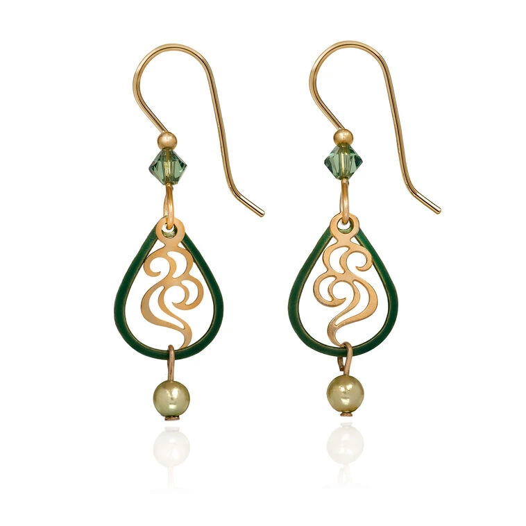 - Silver Forest drop earrings feature an open teardrop design in forest green with gold swirl charm and green crystal and bead accents.