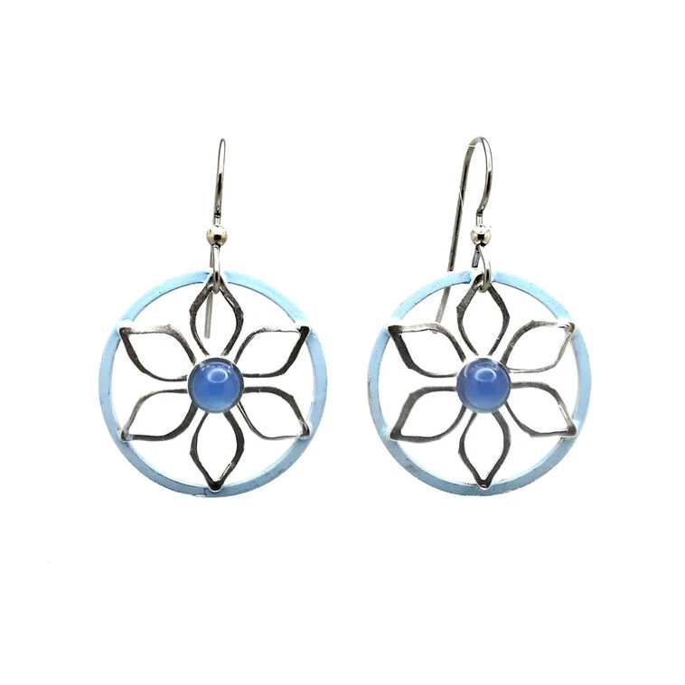 - Silver Forest metal flower earrings feature openwork petals and blue onyx bead centers inside pastel blue circles.
