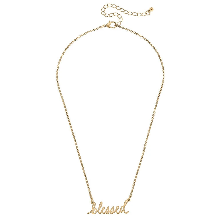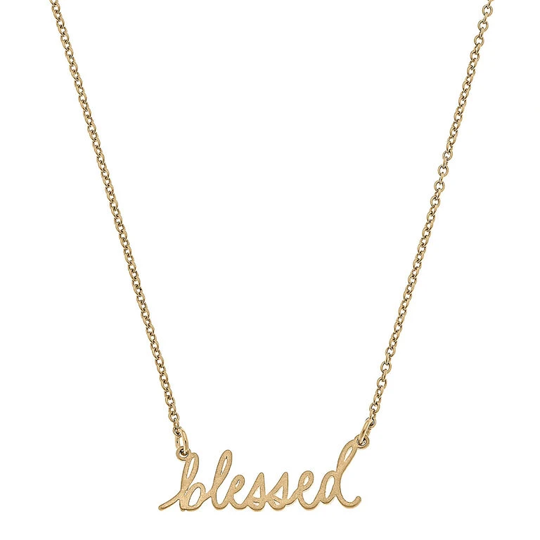 Wear a reminder to be grateful for your blessings with this beautiful accessory. The dainty, worn gold chain features a script “blessed” message and an adjustable length with lobster clasp closure. Neutral accessory is perfect to layer with other necklaces or wear alone for a simple statement. Makes the perfect gift for her birthday, Mother’s Day, holidays or just because.